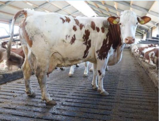Bettina ligt in de ruime diepstrooiselbox te herkauwen als we haar op de foto willen zetten. Sta je even op dame! Ze komt soepel in de benen, is zichtbaar in een puike conditie en heeft een goed uier waarbij de ophangband niet zichtbaar aanwezig is. Kortom, dit is een échte Engadin-dochter.