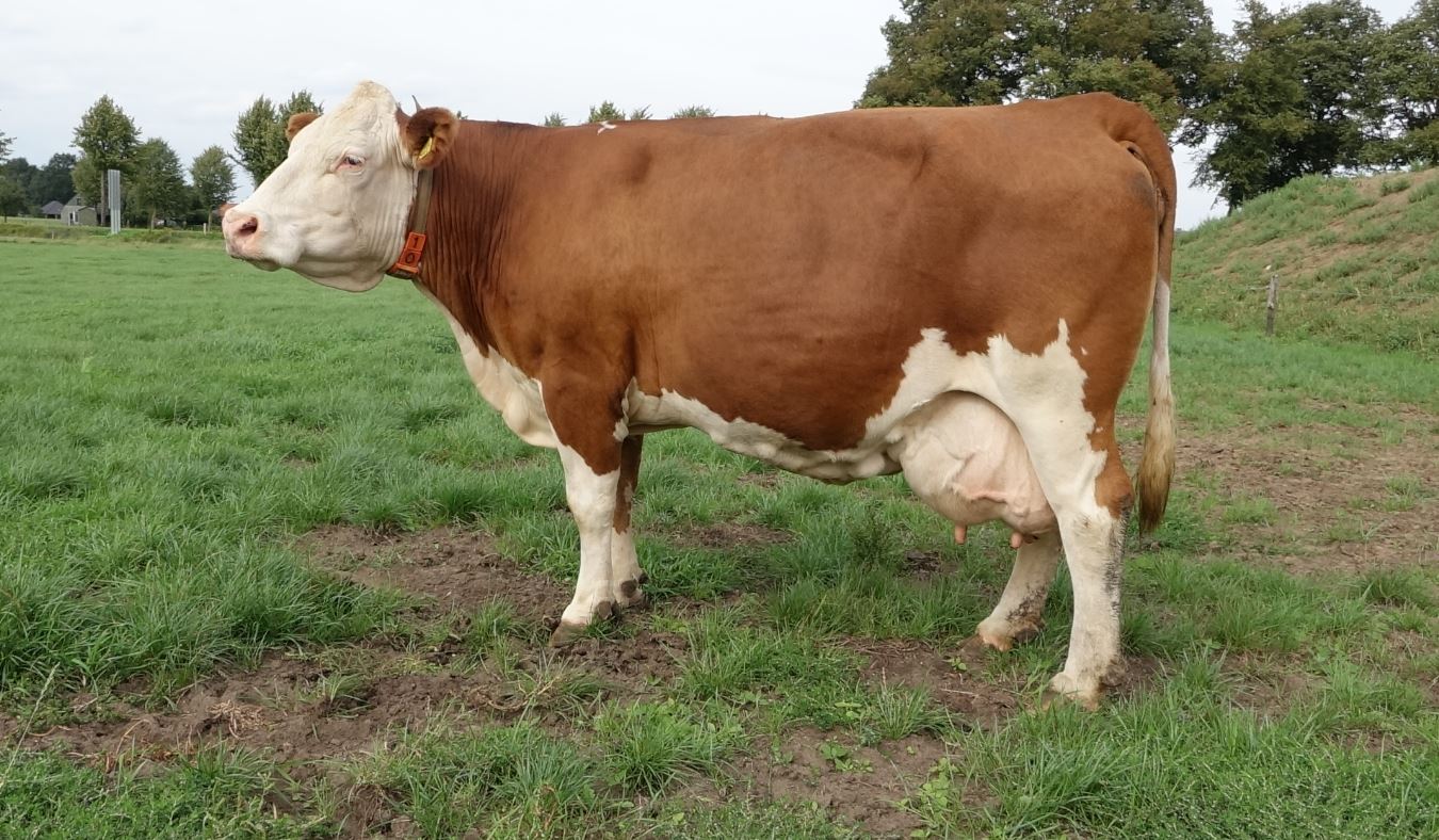 Gemiddelde productie: 32.8 kg melk/dag met 4.73% vet en 3.70% eiwit. LW: 113 ‘Ze was als jonge koe een fotomodel. Dat is ze nog steeds als je haar kop ziet. Ze heeft nog een werkbaar uier, geeft veel melk met top gehaltes’