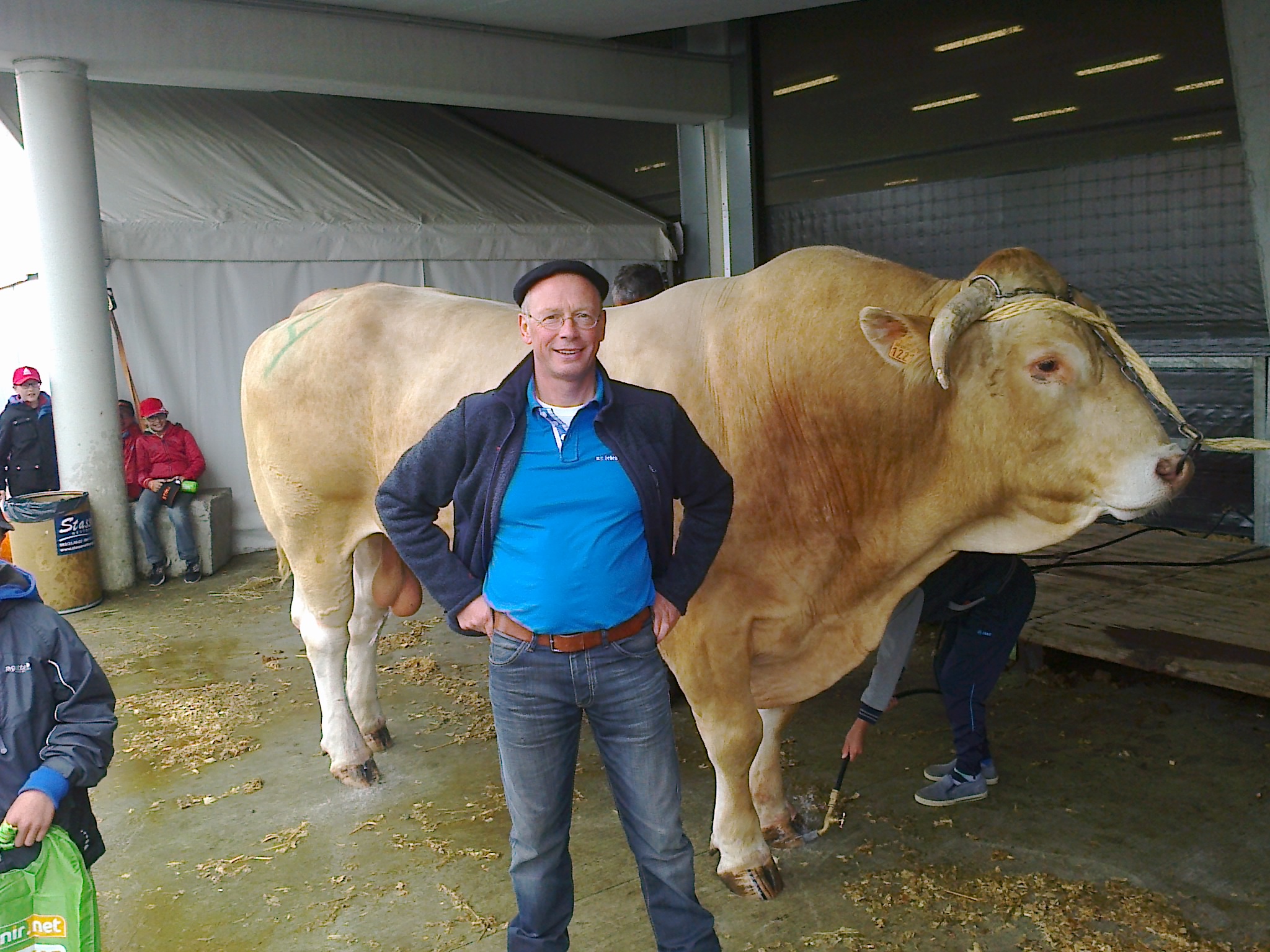 Stef Beunk liet zich heel stoer fotograferen bij deze Blondestier met een kruishoogte van meer dan 1.75 meter.