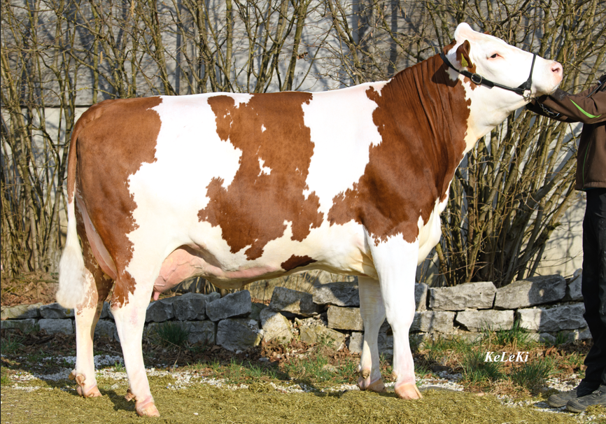 Deze 50% hoornloze stier (aankoopprijs 140.000 euro) komt uit een uitzonderlijk melkrijke koefamilie. Moeder Gracia is een topmelkkoe; grootmoeder Glife is een brede, sterke Fleckvieh koe met een voortreffelijk kruis en krachtige benen. Beide dragen ze uiers van zeldzaam hoog niveau. Tijdens de Fleckvieh reis stonden we er met ons neus bovenop toen we zijn fokbedrijf bezochten. Indrukwekkend!