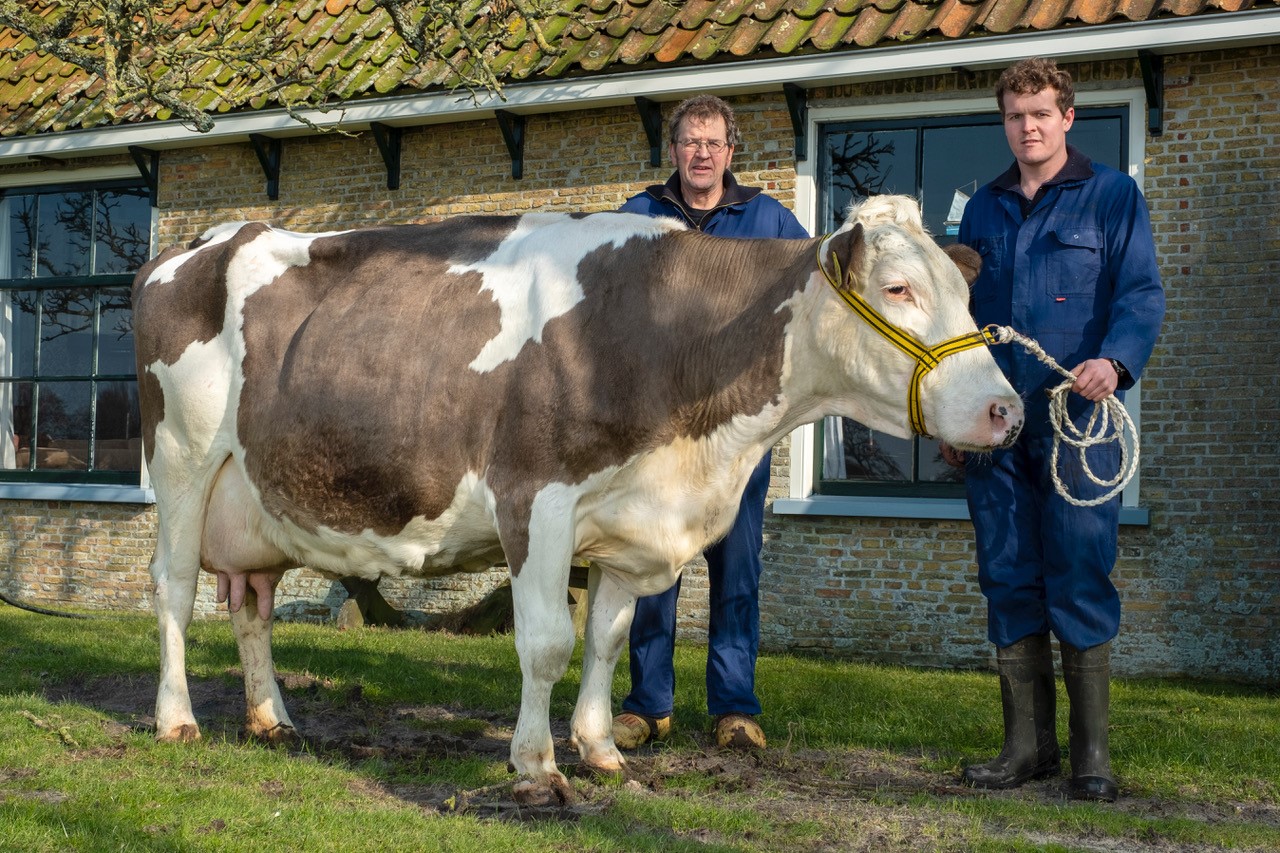 “Annie is super fit en gaaf. Als je haar ziet lopen zou je niet zeggen dat ze al 100.000kg melk gegeven heeft. Haar uier zit nog op de hak, het celgetal is laag en ze geeft nog 30 liter daags. Zij is de eerste 100-tonner op ons biologisch melkveebedrijf”, vertelt ons Egbert Zorgdrager. En inderdaad, we zien een onverslijtbare koe, met stevige spenen en een gemiddelde lactatiewaarde van 110. Vader BFG Ruap bevestigt hier zijn faam als ‘koeienmaker’.