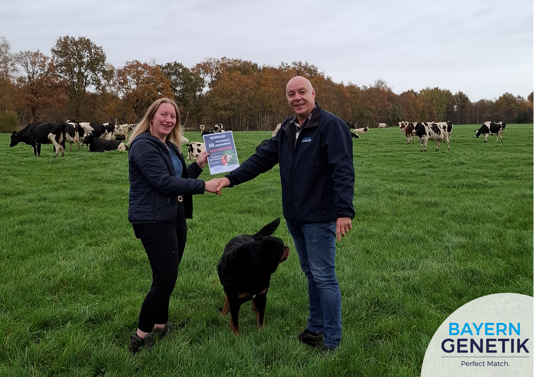 Thuis runt Joyce samen met haar vader en broer een melkveebedrijf met Holsteins. “We praten al langer over het inkruisen met Fleckvieh, maar het kwam er steeds niet van,” vertelt ze. “Op de beurs hebben we informatie ingewonnen bij de stand van Bayern Genetik. ” De hoofdprijs, 25 rieten van de 100% hoornloze stier BFG Megafett PP, kwam precies op het juiste moment. “We gaan er meteen mee aan de slag,” zegt Joyce enthousiast. “We zijn benieuwd wat Fleckvieh ons gaat brengen.”