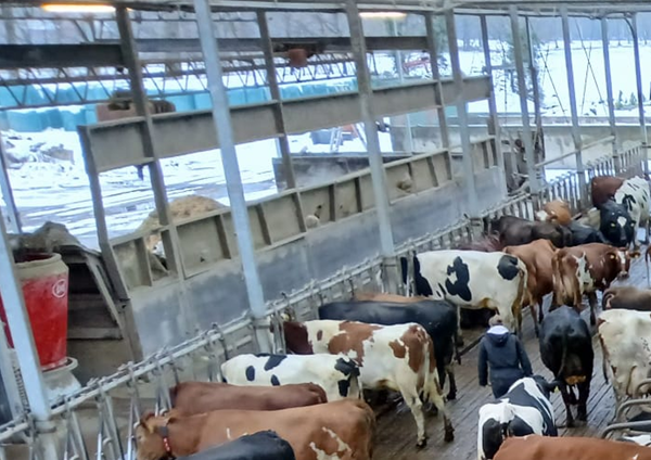 Hier een foto van de volledig open serrestal ‘De Koeientuin’ van de familie Bomers met daarin ca 240 stuks kruisingsdieren. “Wij hebben een paar frisse dagen achter de rug maar de koeien geven er niets om. Dit is een biologisch bedrijf dat ook behoorlijk geautomatiseerd is en we volgen de 3-weg kruising van Holstein-Jersey-Fleckvieh. Er lopen misschien nog een handvol zuivere dieren tussen. We hebben we een gemiddelde productie van 30kg melk/dag met 4.70% vet en 3.90% eiwit. En we zijn dik tevreden met deze kruising en het bijbehorende melkgeld”, aldus bedrijfsleider Jesper Dieker.